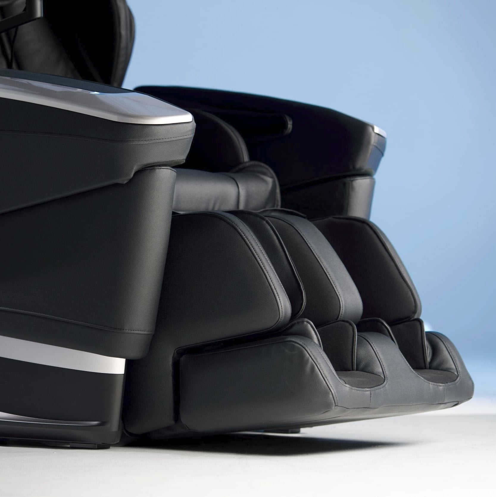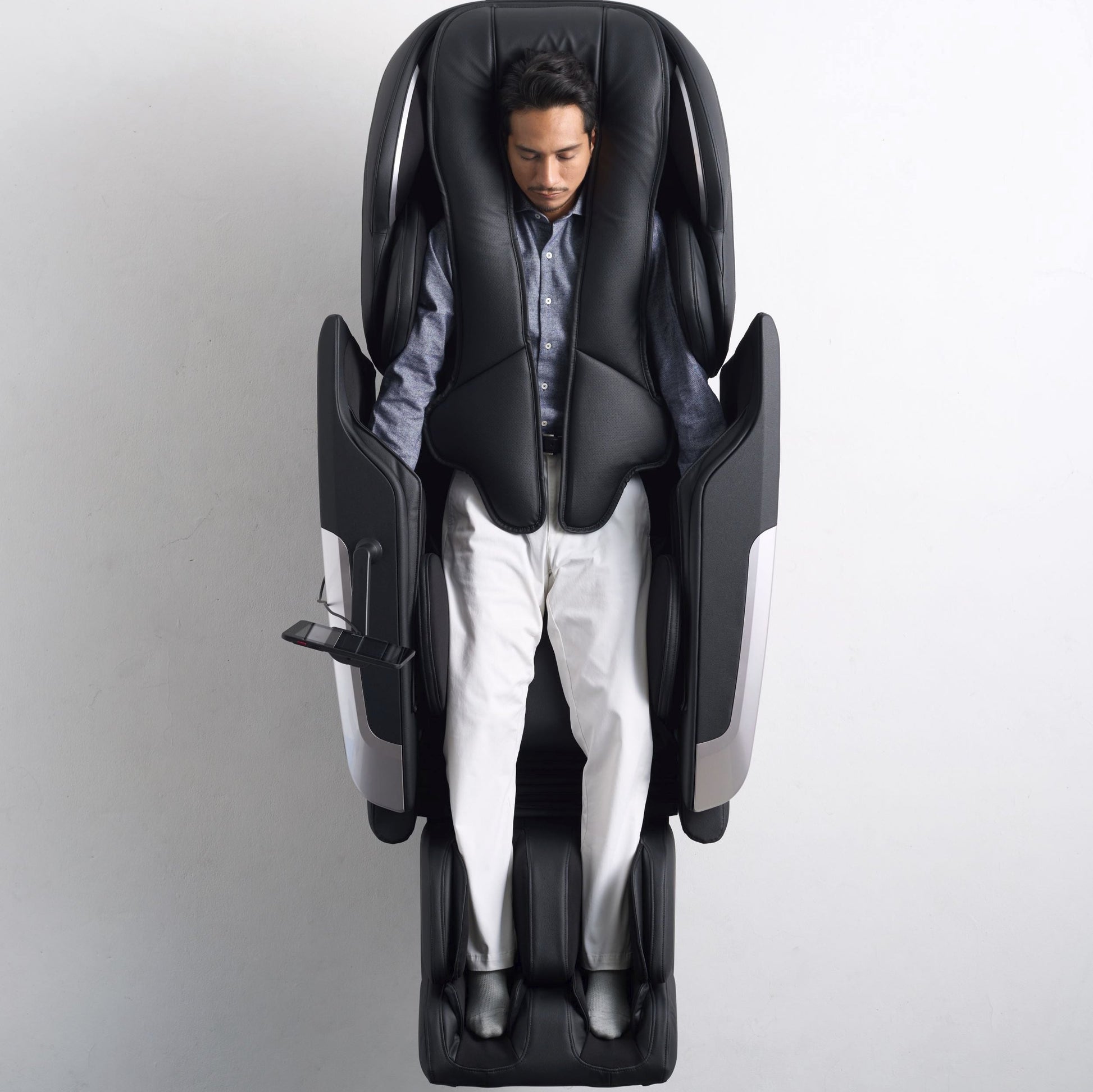 Cyber Relax Ai 可透過 8 吋全彩觸控面板輕鬆操控,其設計可適應不同體型的用戶,並配有雙腿支撐延伸裝置,適用於身高 6 英尺 4 英寸(約 1.93 公尺)以下的用戶。其特殊的平躺式框架增強了上背部按摩效果,而手臂按摩系統可隨您向後滑動,確保完美貼合,手臂不會滑出。